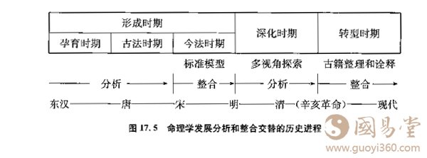 辛亥革命以后,八字命理学开始了它的转型时期。由于封建皇朝的破灭,五四新文化运动的启蒙,西方科学、民主思想的影响,以及白话作为书面语言的逐渐普及,传统命理学跨入了新的整合时期。从这个角度看,整个传统命理学发展的历史,也是一个分析和整合相互交替的历史进程。当然,这是指其研究主流而言的,可以图示如下: