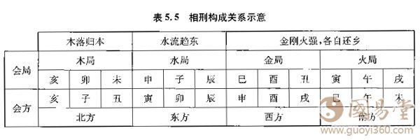 现在,回过头来,接着谈相刑的构成问题。了解了地支的会局和会方,就比较容易:理解构成相刑的原因了。《五行大义》上说的“木落归本”,事实上,就是地支亥、卯、未组成的木局与会成北方水一气的亥、子、丑构成了相刑的关系。之所以称作木落归本,是因为水是木的母亲。同样,组成水局的申、子、辰跟会成东方一气的寅、卯、辰木也形成了相刑的关系,故叫水流向未(也称水流趋东)。至于金和火,由于过刚或过强,则各自由其本身的局和方构成了相刑关系,所以称为各还其乡,即巳、酉、丑对申、酉、戌;寅、午、戌对巳、午、未。我们把上述的这四种方与局构成的关系,列表如下: