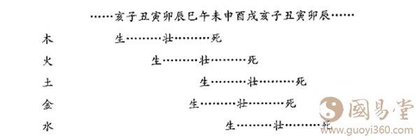 木生于亥,壮于卯,死于未,三辰皆木也。火生于寅,壮于午,死于成,三辰皆火也。土生于午,壮于戌,死于寅,三辰皆土也。金生于巳,壮于酉,死于丑,三展皆金也。水生于申,壮于子,死于辰,三辰皆水也。